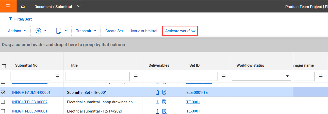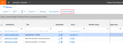 From the Submittals register, select a submittal, and then click the Activate workflow button in the toolbar. Alternatively, you can open a submittal, and then click the Activate workflow button in the Details page toolbar.