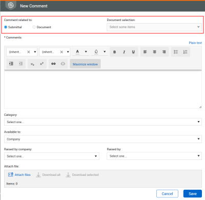If you want to make comments on the submittal or on an individual document, go to the Comments tab, and then click the Add icon. The Comments dialog box opens.