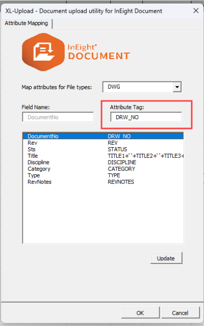 XL-Upload can extract the document attributes from Microsoft Office (Word, Excel, and PowerPoint) files and PDF files in addition to AutoCAD DWG files. To use this feature, the attribute mapping needs to be set up in XL-Upload. The attribute mapping maps the attributes in the original files to the corresponding spreadsheet fields.