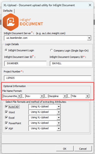 Select the File Name Format fields that match your document naming convention. XL-Upload will automatically populate the spreadsheet with the identified values.