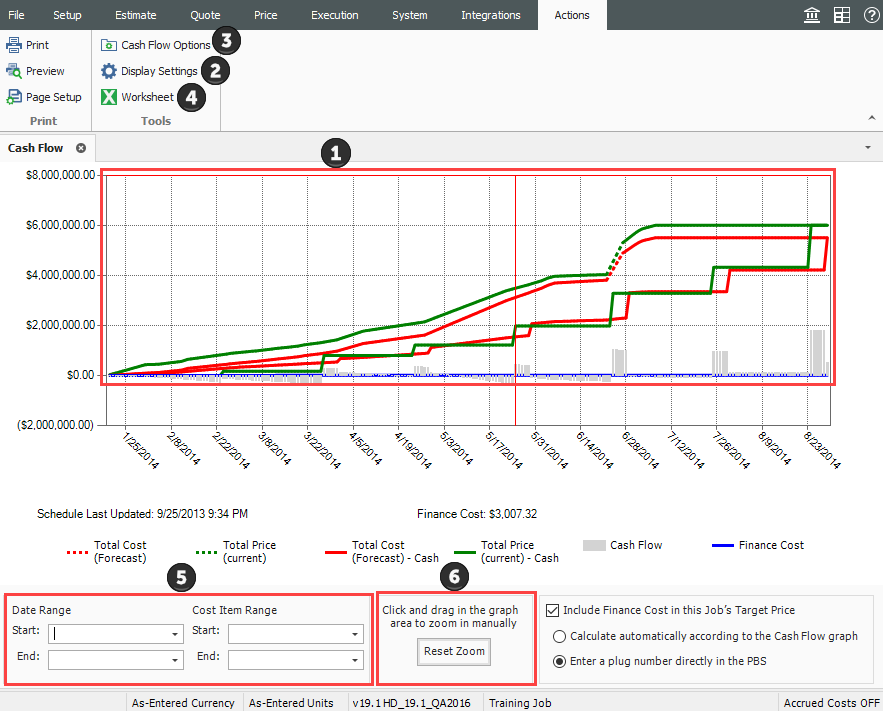 The graph displays the projected cash flow of your project, along with job financing expense, individual cost category costs and resource utilization.