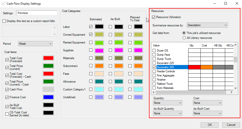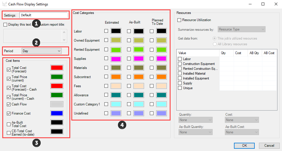 You set up your resource utilization settings from the same Display Settings window you use for setting up Cash Flow, Display Settings