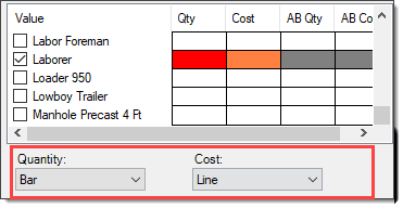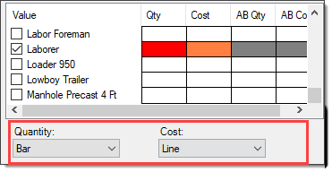 From the Quantity and Cost drop down lists, you can select how your quantities and costs will display on the graph. In this case select the Quantity to display as a Bar and Cost to display as a Line.