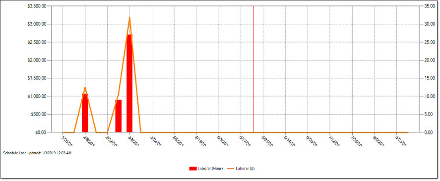 You can also use the Cash Flow graph to report on resource utilization. For example, you may want to run a report that displays a work hours curve for a particular labor trade or to see the peak usage times for a particular piece of heavy equipment.