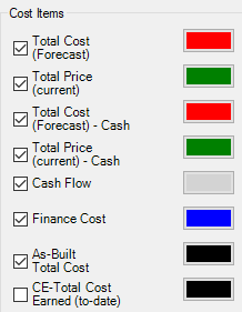 Your Total Cost (Forecast) – Cash displays as a solid red line, indicating your costs, based on when your cost items are scheduled and the cost timing defined in Cash Flow Options