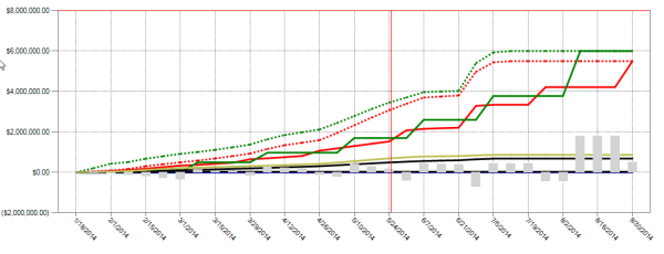 Your Total Price (current) – Cash displays as a solid green line, indicating your revenue, based on the timing of your pay items and the revenue timing defined in Cash Flow Options