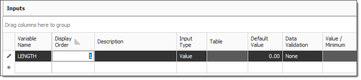 Navigate to the Inputs data block. In the first empty field under Variable Name, type Length, then press Tab.