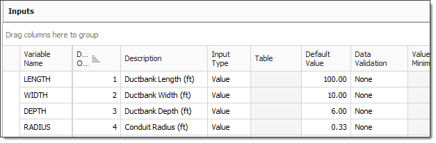 The Inputs data block is where you define the questions that will be asked of the user when they employ a Cost Item Assembly. Inputs can be value, table, or text inputs and validation rules can be specified for value-type inputs such as minimum or maximum values that are acceptable, or default values that appear when the Cost Item Assembly is employed. These Inputs will be the parameters used in calculations to drive the Cost Item Assembly outputs.