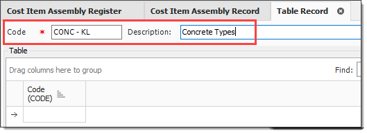 Right click in the Table Code field and select New.