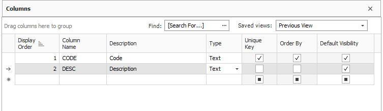 In the Columns section, enter in the following column names and descriptions, choosing the Text Type.