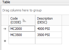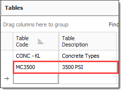 Within the Formula Editor, you can use tables to provide reference data for use in calculations. For example, the following illustration shows a table that stores values for various Concrete Strengths along with their associated resource code values.