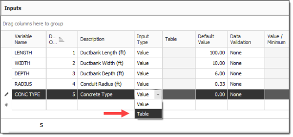 In the Inputs data block, select the Default Value field for the CONC TYPE input.