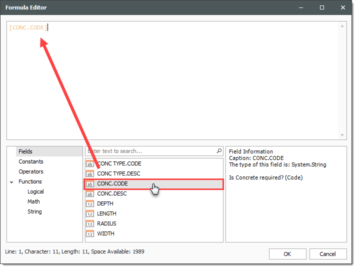 In the Formula Editor, and from the Fields section, double click [CONC.CODE].