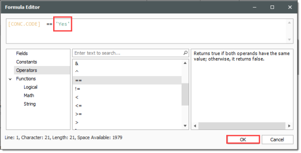 In the Operators field, double click on the ‘==’