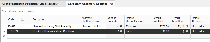 Cost Items for a Cost Item Assembly are created within the Cost Item Assembly Record, not in the CBS Register.