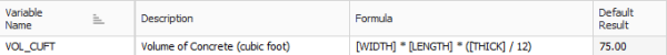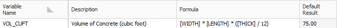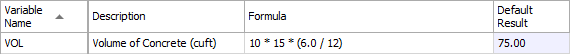 The [VOL_CUFT] calculation in the following example is the same as in the preceding example, but replaces the 10 foot, 15 foot, and 6 inch values with the variable names, which you would provide when the Cost Item Assembly is employed.