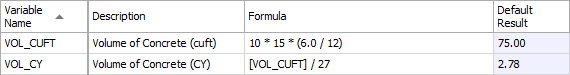 Variables are placeholders for values that can be changed based upon user input or calculation results, and they can be used to simplify a complex formula. Variables require a name that is unique within the Cost Item Assembly, and the syntax for referencing a variable in a formula is to enclose the entire variable name in [brackets]. Using the preceding example, a calculation named [VOL_CUFT] determines the cubic foot volume of 75. The second formula then references the value stored in the variable [VOL_CUFT] and divides it by 27 to calculate the cubic yard volume of 2.78.