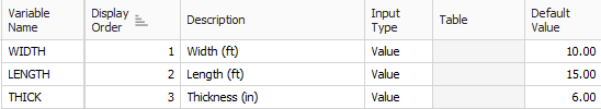 Input variables are also used to store user inputs as described above. In the following example, three inputs are created in the Inputs section of the Cost Item Assembly and employing this Cost Item Assembly will prompt the user to provide the values for the width, length and thickness of the concrete slab, those values are stored in the variables named [WIDTH], [LENGTH] and [THICK] respectively.