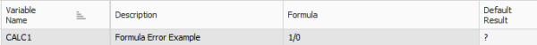 Creating valid formulas can be challenging when calculations start to become more complex. Improper referencing of variables, incorrect spelling of functions, or invalid mathematical operations are all examples of ways in which a formula expression can be invalid. When a formula results in an invalid expression it will return a NULL value. A NULL value is displayed using a ‘?’ character and will preclude you from employing the Cost Item Assembly in the job. In the following example, a formula that divides any number by zero generates a mathematically invalid result and is indicated by the ‘?’ character.