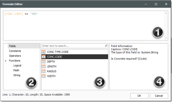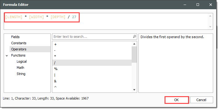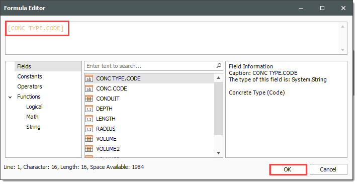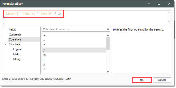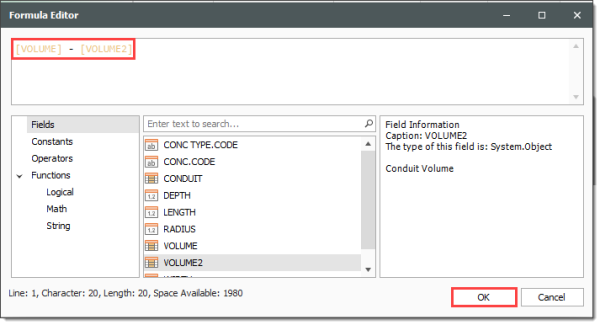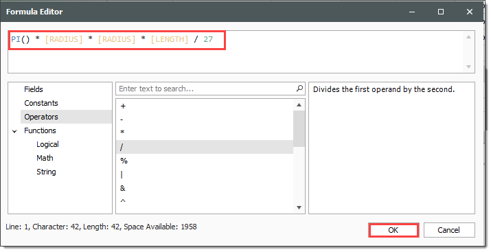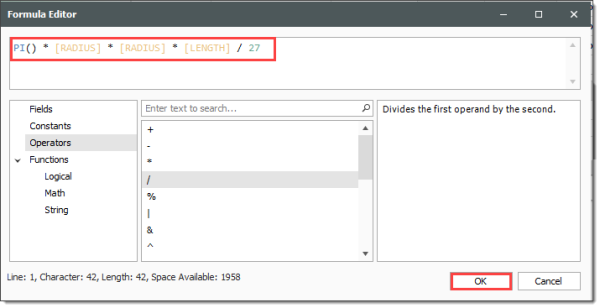 Enter the following formula, using the PI() function from the Functions > Math tab, the radius and length from the Fields tab, and the available Operators tab, then click OK.