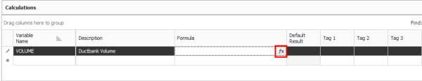 In the blank row under the Variable Name field, type Volume2 and enter the Description Conduit Volume, then click on the fx button to open the formula editor.