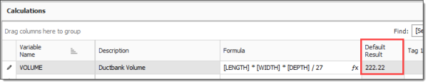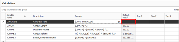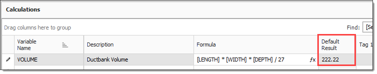 As in the preceding example, the [VOL_CY] calculation takes the result of the [VOL_CUFT] calculation and divides by 27 to convert the volume from cubic feet to cubic yards.