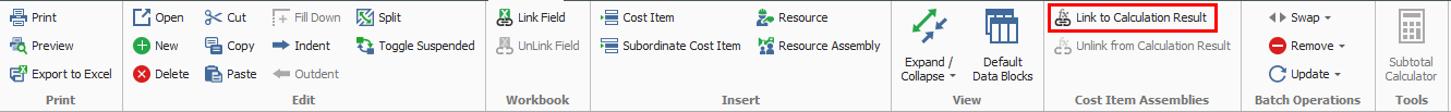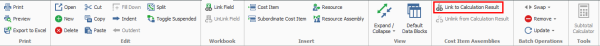 The results of calculations can be assigned to any number of different fields in the Cost Items data block of the Cost Item Assembly record. It is common to link dimensional calculations to the Forecast (T/O) Quantity fields of various cost items, but calculation results can be linked to many other fields such as Productivity fields, Description fields, and even Resource Employment fields such as Quantity or Code. You can link multiple cost item fields to a single calculation by holding the CTRL key. To link a calculation to a cost item, you right click on the cost item field and then either select to link to the calculation result from the context menu or from the ribbon.