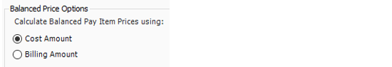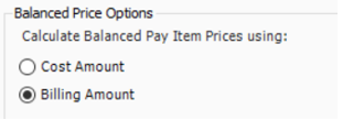 This option determines if a pay item will use the cost or billing amount values of the assigned cost items as the basis for determining a balanced bid price. This also determines if the AutoPrice command will use the cost or billing amount values.