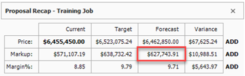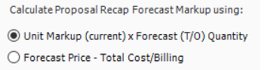 This option determines how the Markup is determined in the Forecast column of the Proposal Recap data block on the Pay Item & Proposal form.