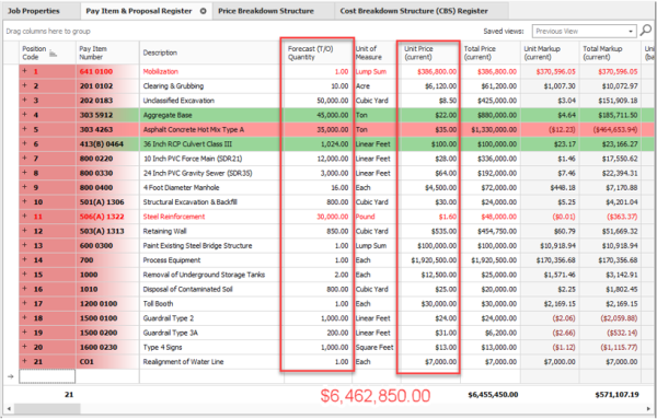 Unit Markup (current) × Forecast (T/O) Quantity - The Forecast Markup amount is determined as the sum of each Pay Items Unit Markup (current) multiplied by the Pay Items Forecast (T/O) Quantity.
