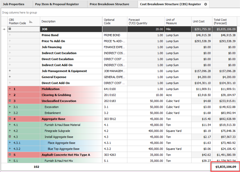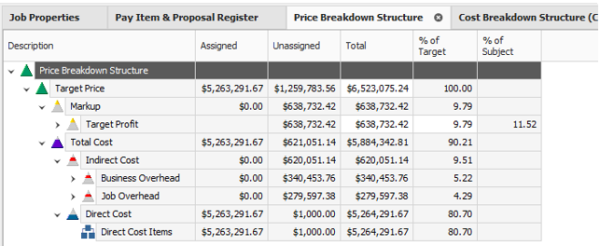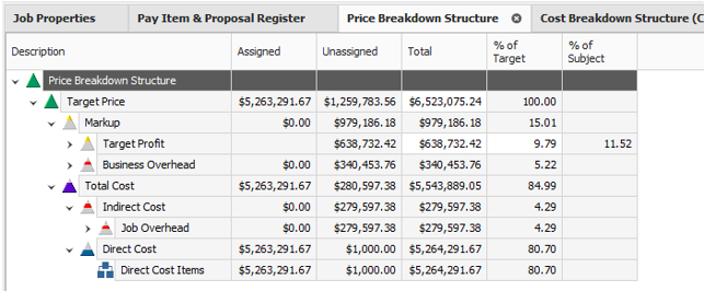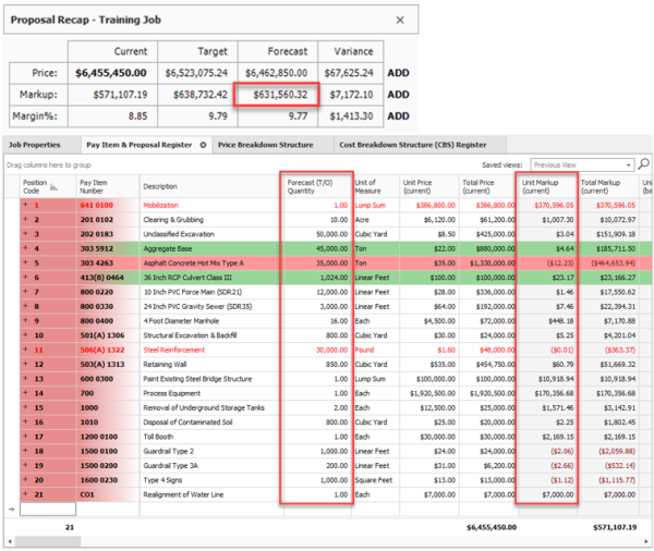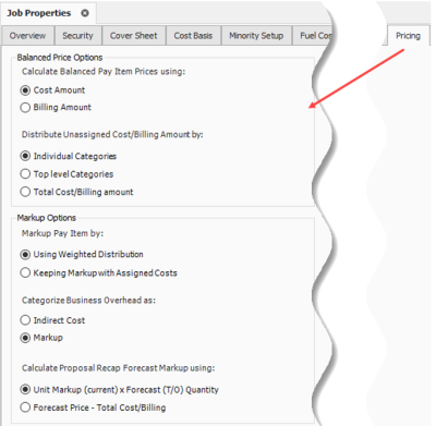 In Job Properties Overview > Pricing, there are balanced price and markup options in the bid pricing area which lets you categorize costs, markup various costs in an estimate, and distribute that markup throughout the bid which establishes balanced bid prices.