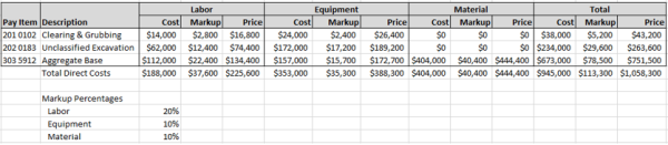Keeping Markup rates to Assigned Costs. This option uses the cost category amounts of all assigned cost items and calculates the markup by applying markup percentages as defined in the direct and indirect cost markup records. Excluding cost items from the dependency tab of the markup record precludes the application of that markup percentage to the assigned costs on that pay item.