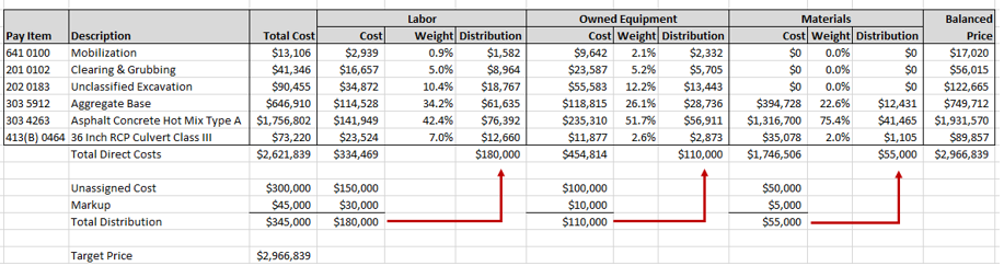 Any costs in the estimate not assigned to a pay item needs to be proportionally spread back to all pay items to determine a balanced bid price. This option lets the user choose the basis for calculating the weighted distribution of any unassigned costs plus markup.
