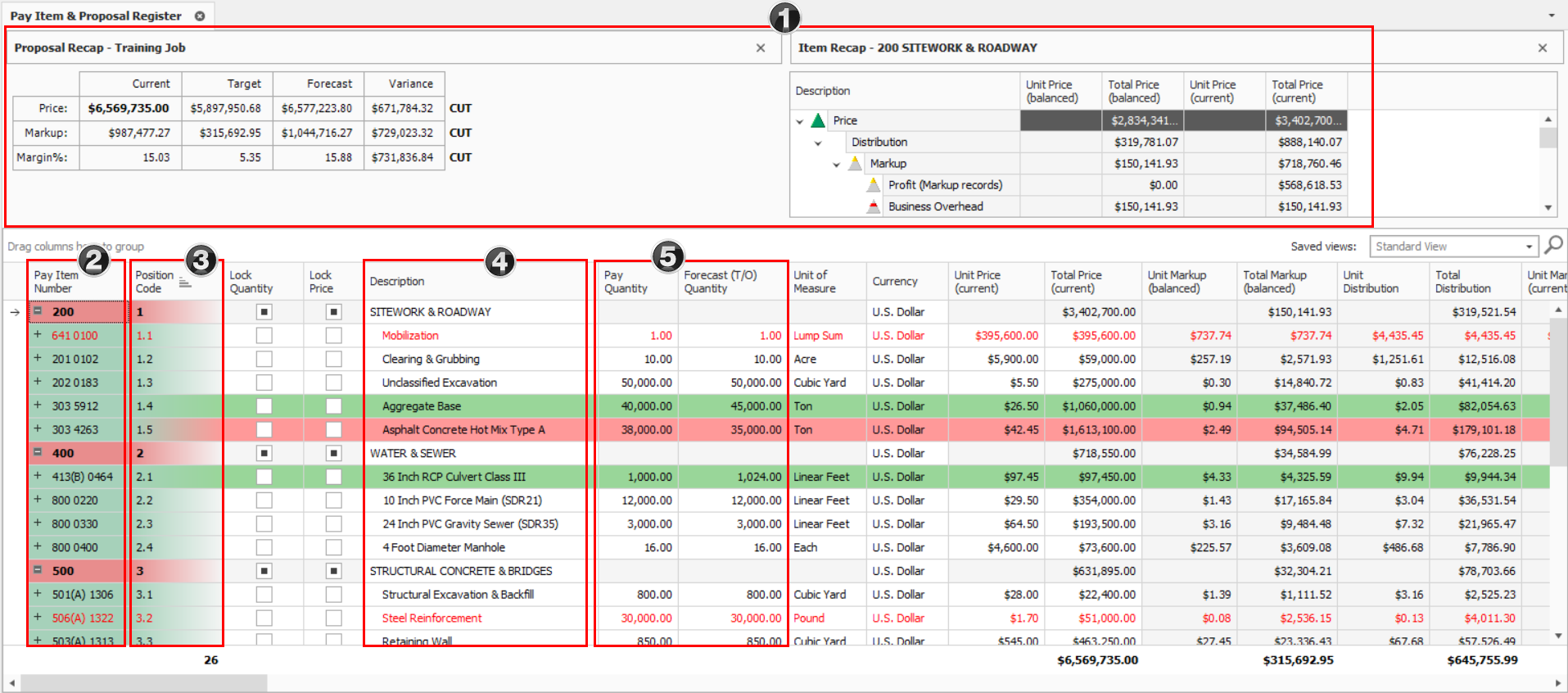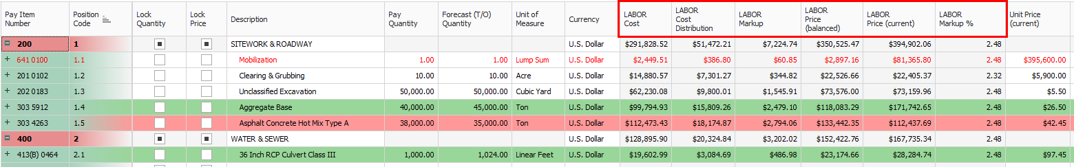 Owners are increasingly requiring more information from contractors as part of their bid submissions. Many times, this is a further breakdown of a bid price such as separating the price of an item based on its labor cost, material cost or man-hours. Select columns in the Pay Item & Proposal register enable users to summarize their pay item prices by up to 10 price categories.