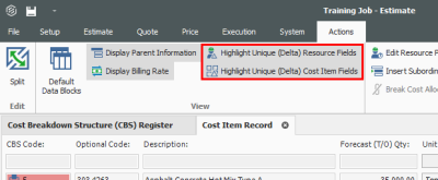 You can turn the highlighting of unique resource and cost item fields off and on from the Actions menu of the Cost Item Record, under the View section.