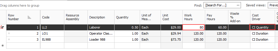 Each type of resource has a default cost driver. For example, Labor resources are duration driven so the cost driver is CI Duration, meaning their costs are driven by the duration of the cost item. If you want an Operator to only be assigned to a specific cost item or work activity for half the time, you can change its quantity to .5 and it will be driven by half of the cost item’s hours.