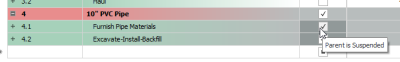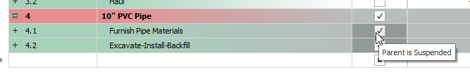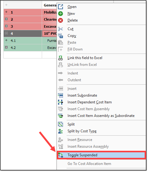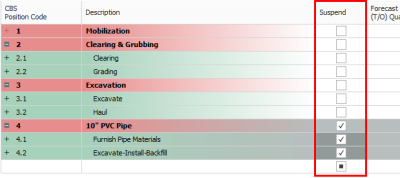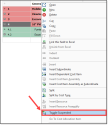 The Suspend feature allows you to turn cost items on and off in order to perform “what-if?” analysis or evaluate alternative approaches to the work.
