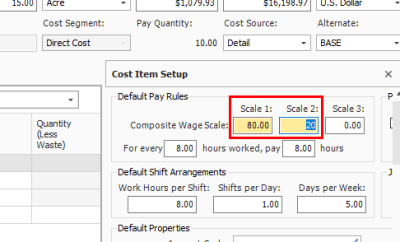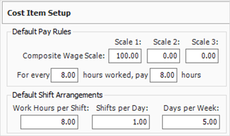 The composite wage scale and work and pay hours are used in the calculation of the cost of employed labor resources. The data reported on the Default Pay Rules tab is, by default, the composite wage scale and work and pay hours defined on the Job Properties - Cost Basis tab for the current job.