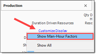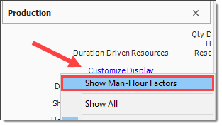 To see the factored Production values, click the Customize Display link on the Production tab and select Show Man-Hour Factors