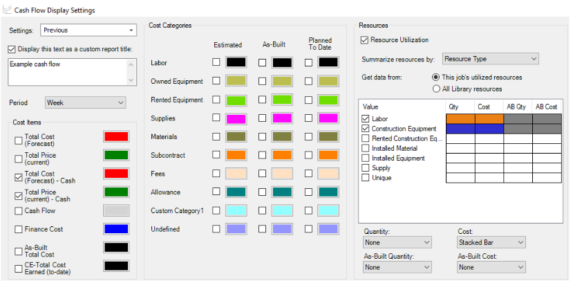 Like the other four cost curves, Period Quantities are used to customize cost curves, which show you a graphical representation of the cash flow and resource utilization so you can assess the proper financing and resource project needs. When the Period Quantities check box is selected, the Cost Curve automatically changes to Cost Item Periods.