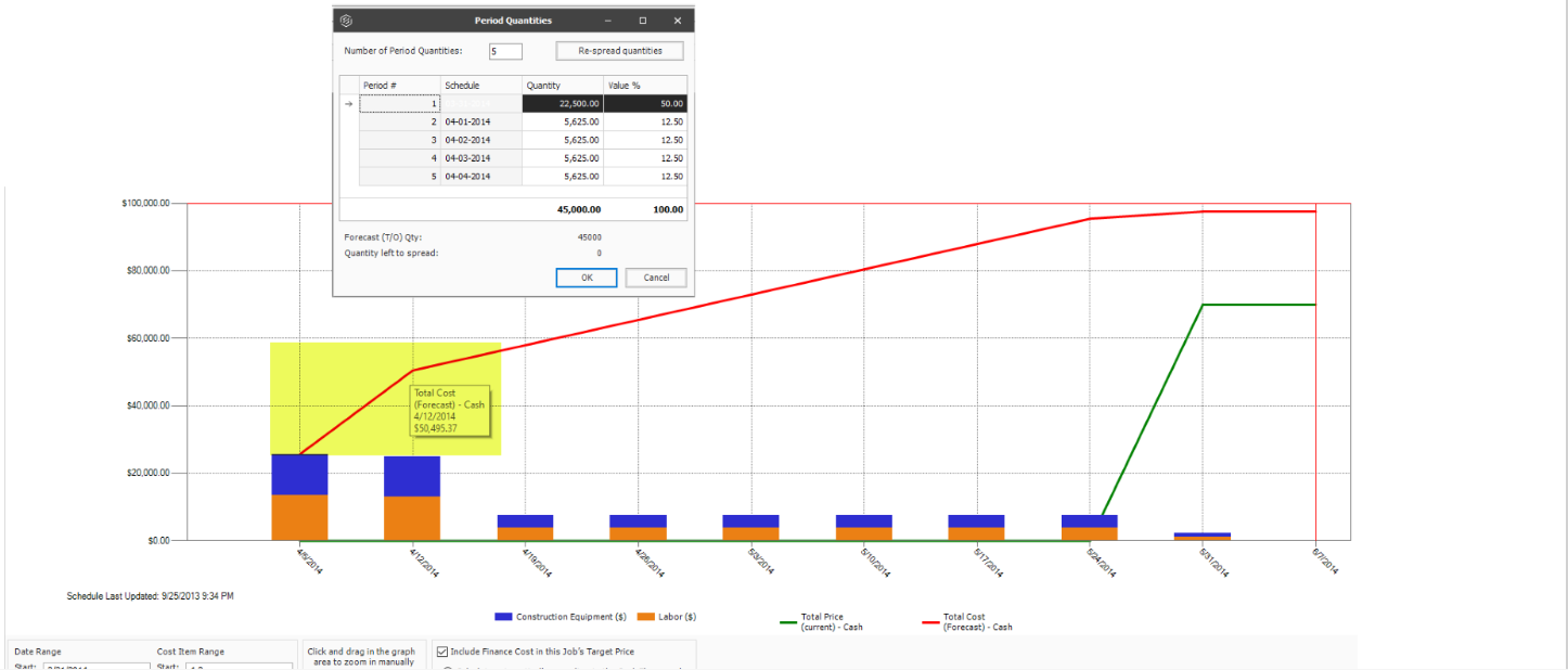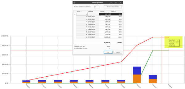 In the example below, since 50% of the cost is incurred when the project starts, period one's quantity is 50% of 45,000 Forecast (T/O) Qty which is 22,500. The remaining costs are then spread equally across the remaining three periods.