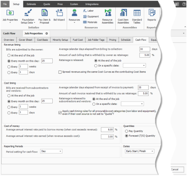 Cash flow rules (revenue timing, cost timing, cost of money, and quantities) describe how cash flow occurs between a contractor and a client, and between contractors or owners and vendors/subcontractors. Cash flow is then calculated based on both the earning and payment terms you specify, and the job's schedule and pay item prices.