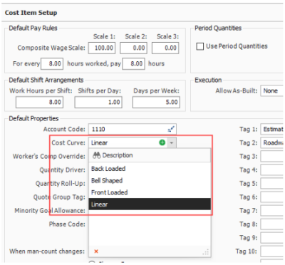 By default, Cost Items have a linear cost curve, which distributes the cost of the cost item equally across all periods for the Cost Item. There are 5 different types of cost curves that can be selected from in the Cost Item Record > Cost Item Setup page.