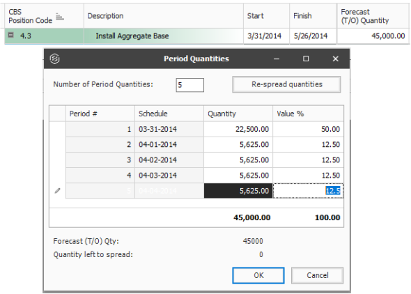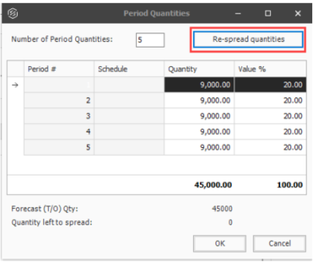 You can also choose to select the Re-spread quantities button to spread the quantities equally among the periods entered in the Number of Period Quantities field.