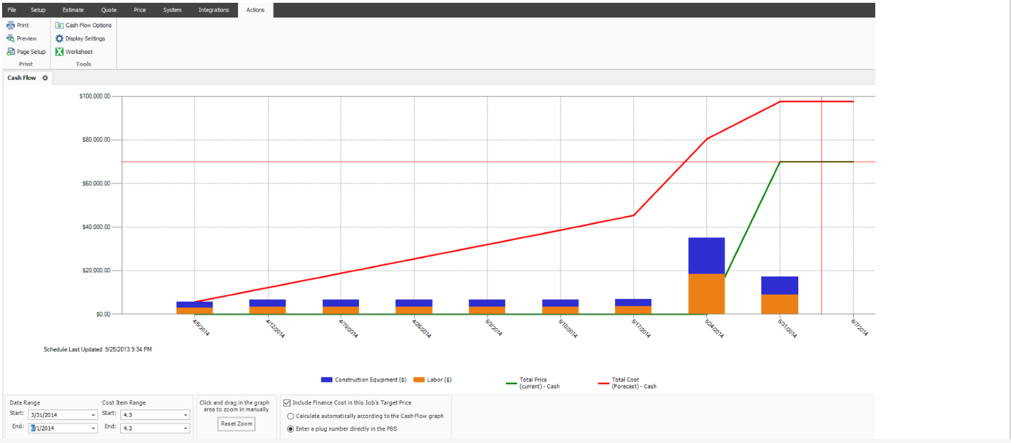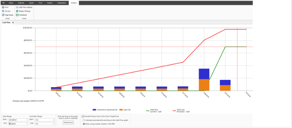 To generate a cash flow curve, the estimate must be populated with schedule dates either directly from integration with Primavera, Microsoft project, or input manually.