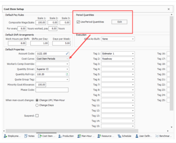 Invoked by using the Period Quantities feature (described below). Cost Item Periods are used to customize cost curves based on the quantities consumed in various periods. In comparison to the other curves which spread the items total cost proportionally based the chosen cost curve, the Cost Item Periods option can generate a more precise distribution of costs to specific periods because the user can simply define how much quantity of work is getting completed in each specific period.