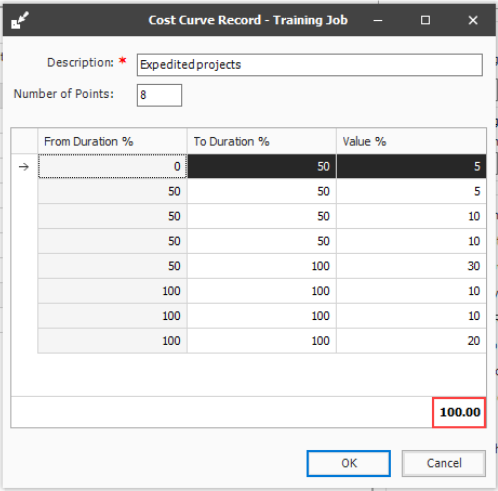 Custom cost curves let you define your own from and to durations along with their associated values, which need to add up to 100%.