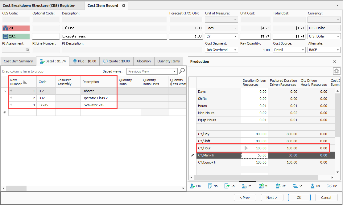 4. Open the Excavate Trench Cost Item Record. Add the following resources: