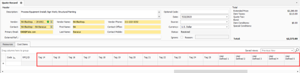 There are 25 tag fields in the Quote Record register cost items tab. There are also 15 user defined fields that let you sort, filter, and group on selected quote records more efficiently.
