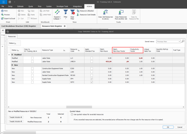 Modified attributes when copying resources from another job – Estimate now shows additional modified attributes in the Resources grid when you copy resources from another job. The modified attributes show in bold red text and indicate resource value changes that impact your job from the imported job. The additional modified attributes provide better visibility of items that impact your current job.